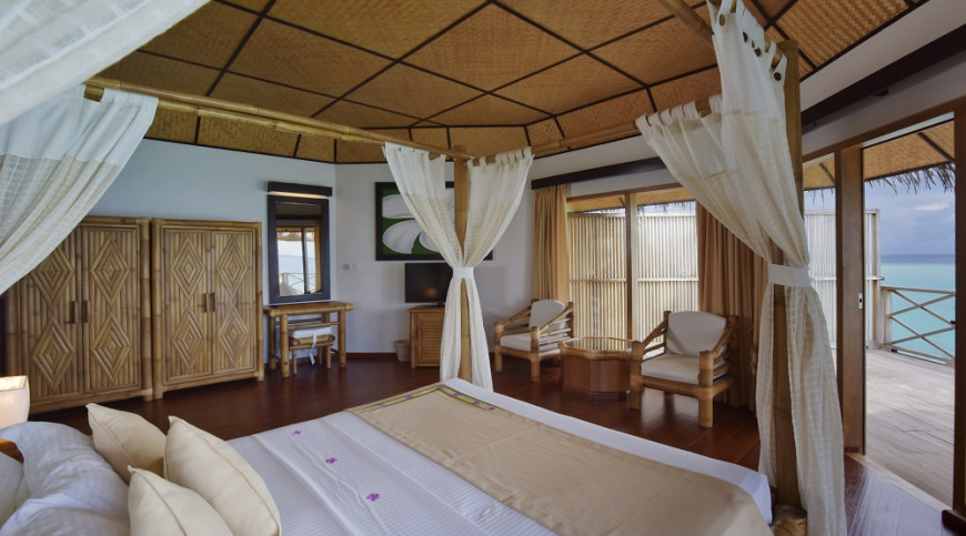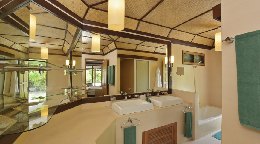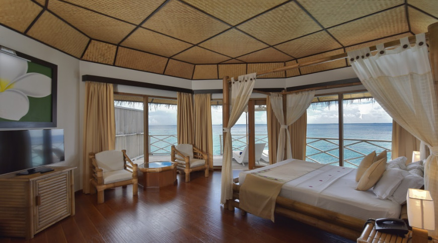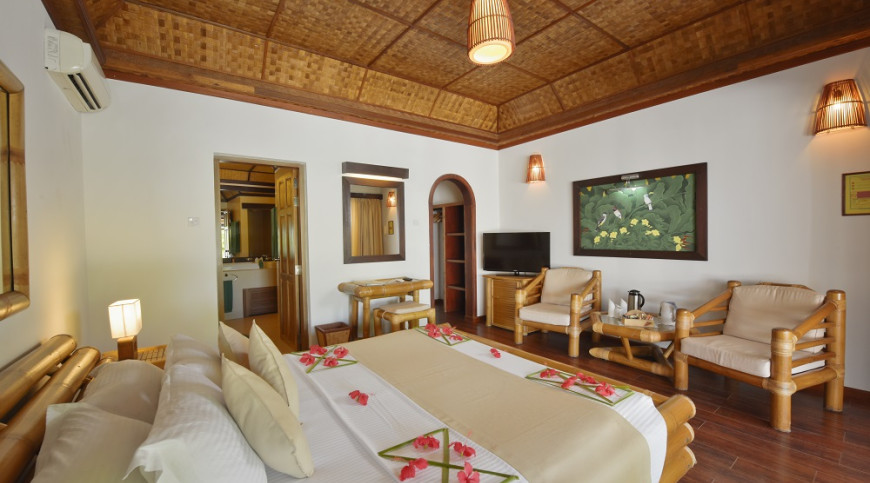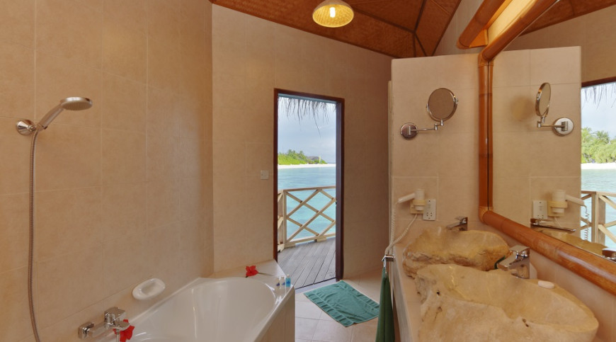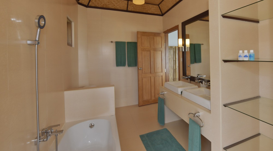 ( 45 sqm ): Renovated by 01st October: Luxury Bath Rooms Closed and with the latest facilities of Panorama Glass Mirror, Twin Wash Basin, Hot & cold fresh water Rain Shower, Bathtub with separate shower, Hair Dryer, WC with privacy, Bath room amenities ( Bathrobe, Shampoo, Conditioner and Shower gel),Bamboo Furniture, individually controlled air-conditioning, Wardrobe, Mini refrigerator, Flat Screen TV with International satellite TV channels, IDD line Telephone, Wi-Fi, Tea / Coffee making Facilities, Front Side of the room with full glass door set, Wooden Deck with seating Chairs and Table , Maldivian Swing , Sun Chairs with cushion, Beach Towel.
