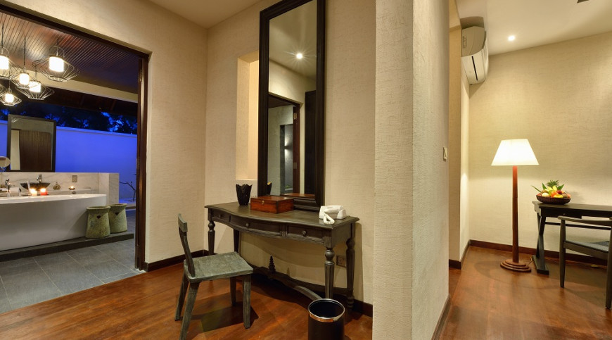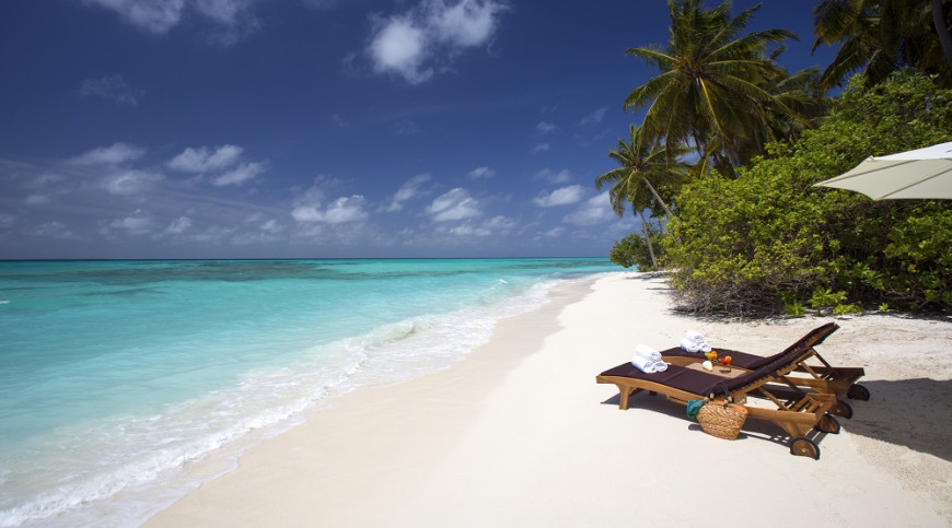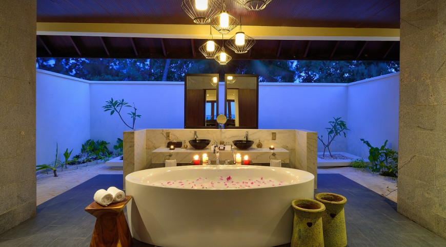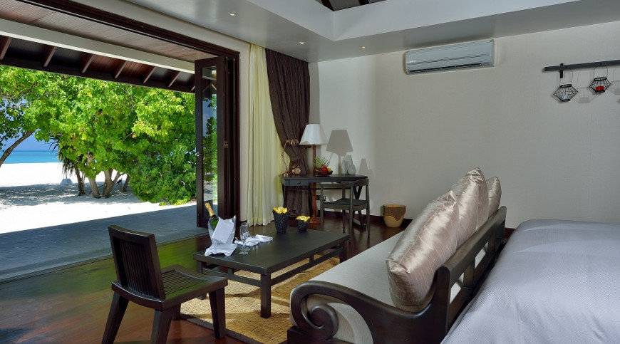 With direct beach access, each spacious villa is tastefully-furnished and features open-air bathroom and private outdoor garden areas with sun loungers. Decorated with Maldivian interiors, villa also includes iPod dock, electric kettle, coffee machine and DVD player. Extras include a dental kit and slippers.
