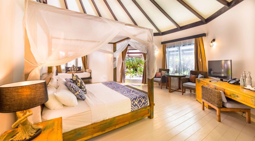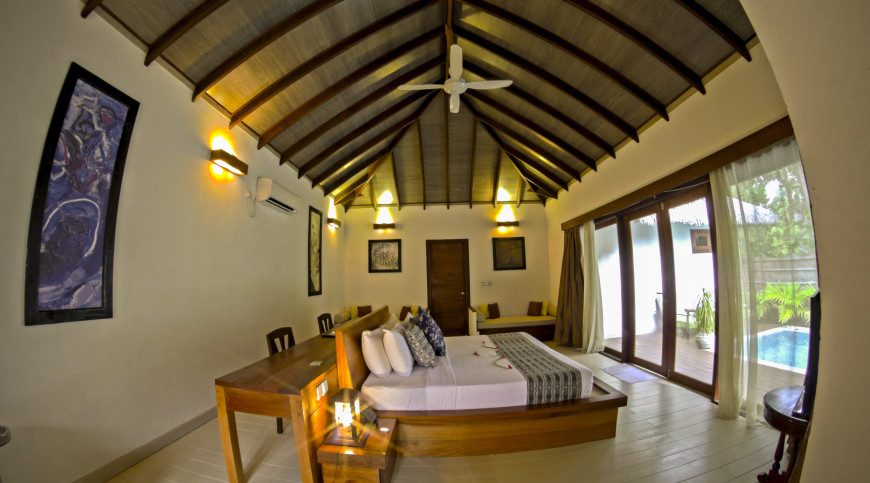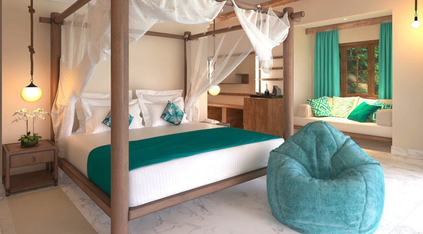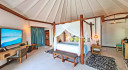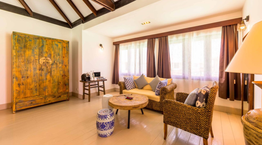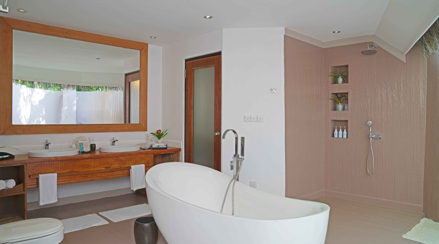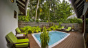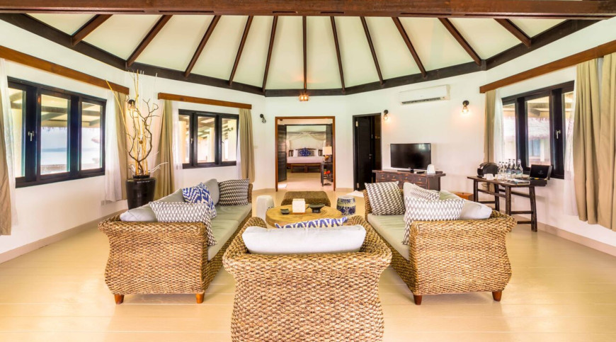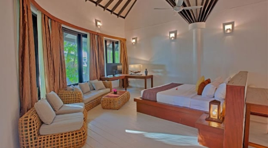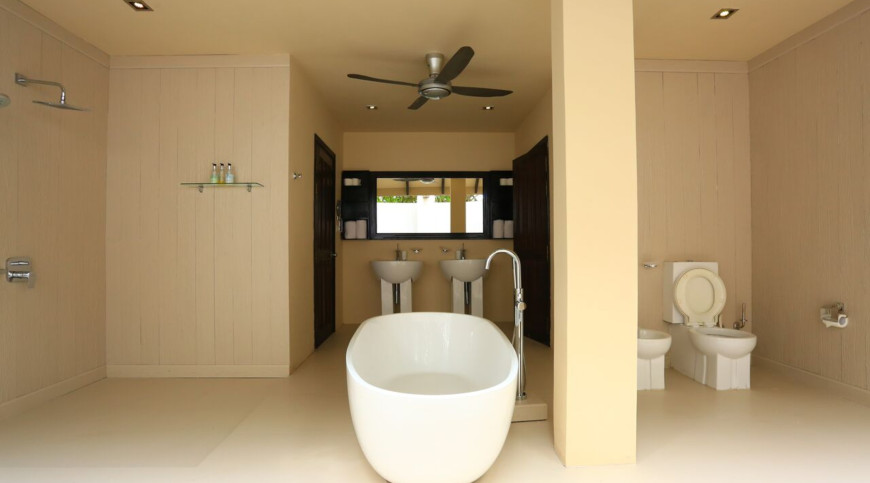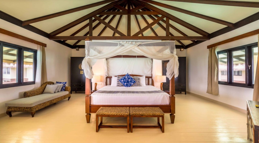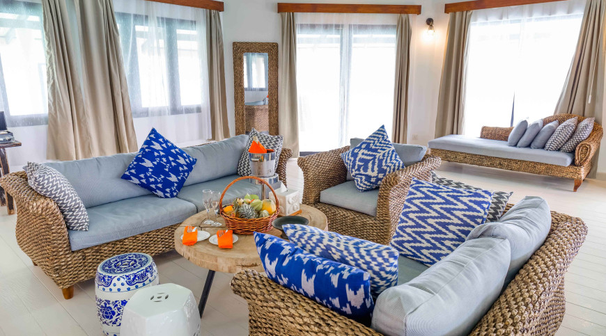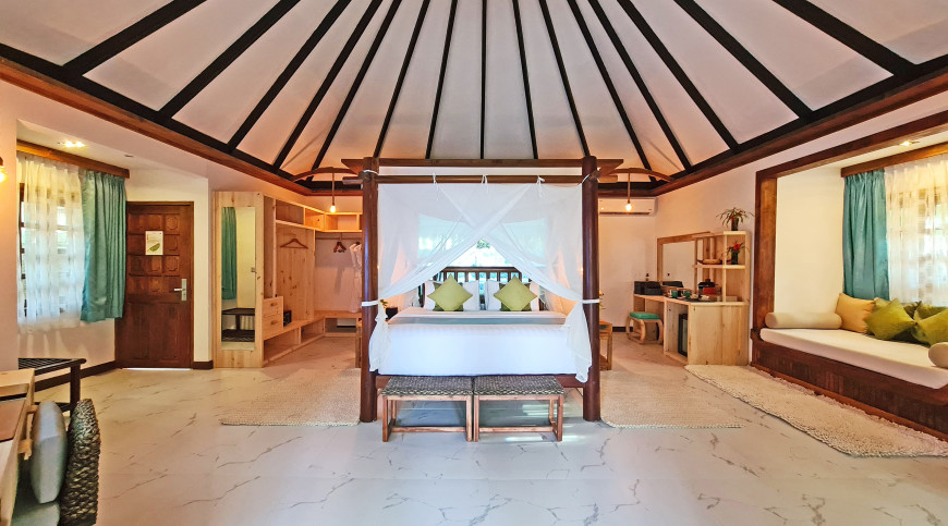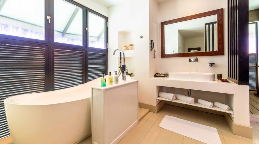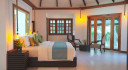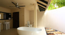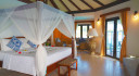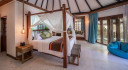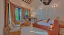Spacious and comfortable, this villa features a quiet position among vegetation, even though offering a direct view of the ocean. It is characterized by a spacious bedroom with a comfortable king bed and a day bed sofa, a bathroom with outdoor rain shower, separate shower and bath tub, and a private garden area with wooden patio equipped with beach chairs with direct access to beach.