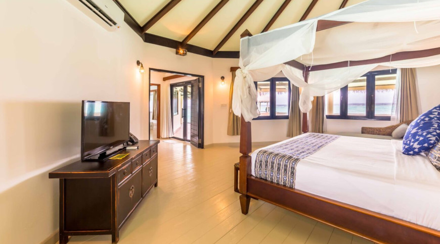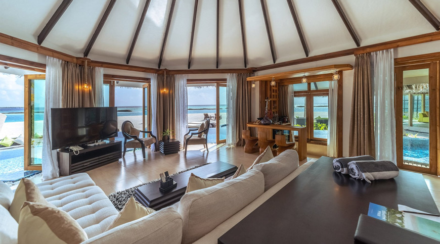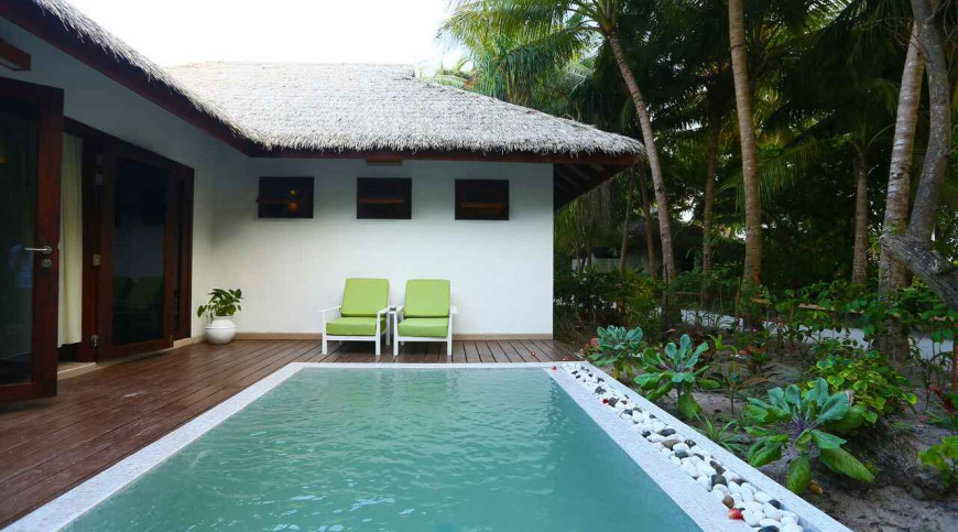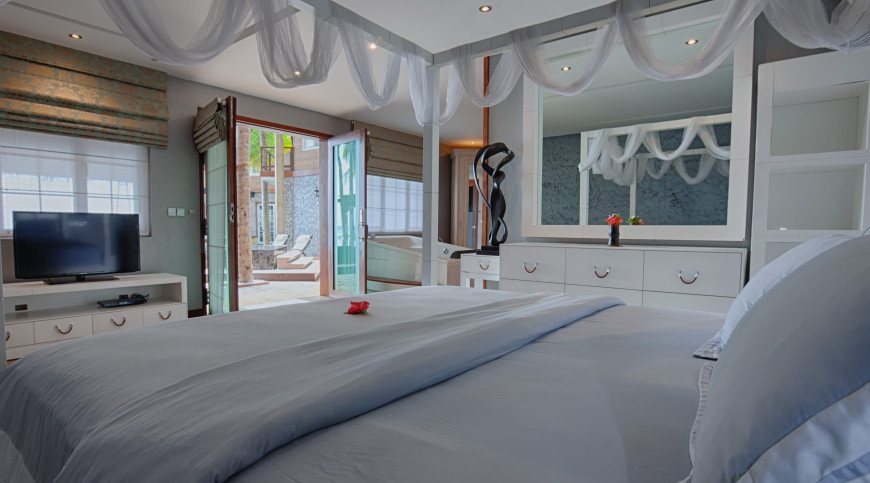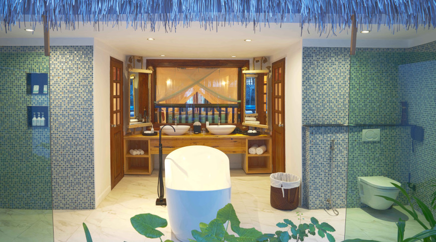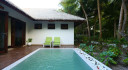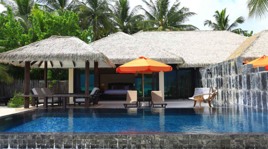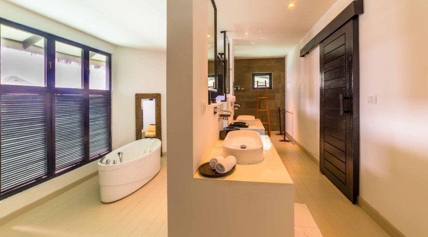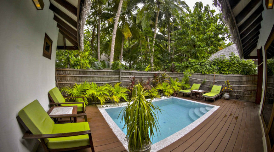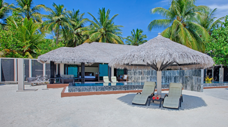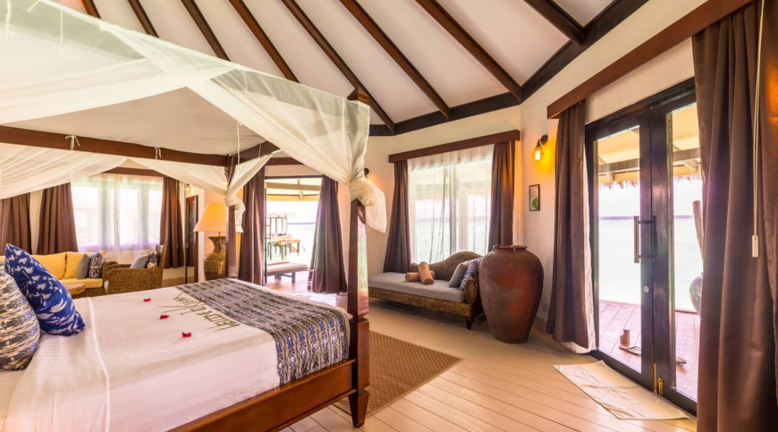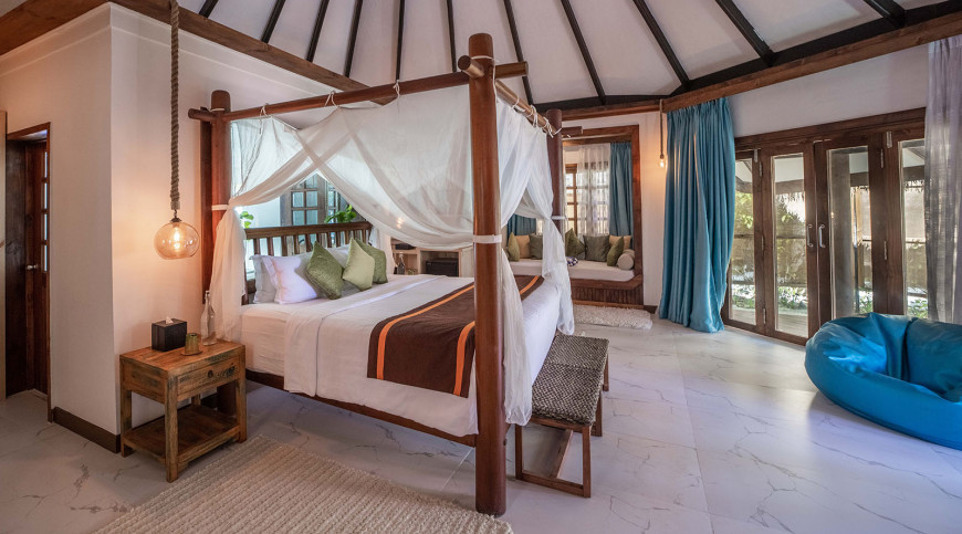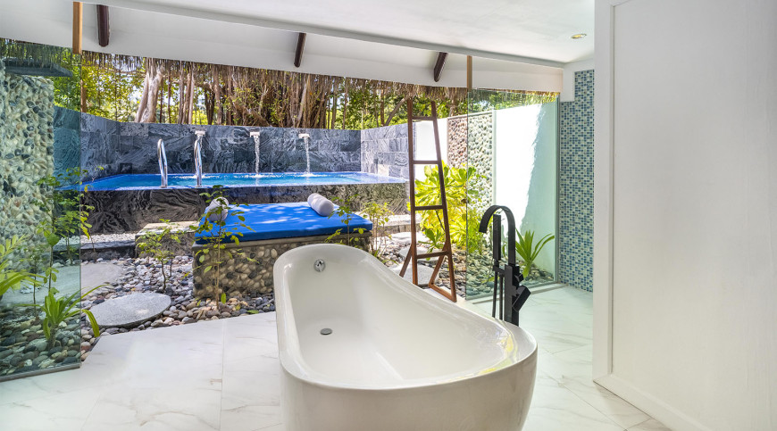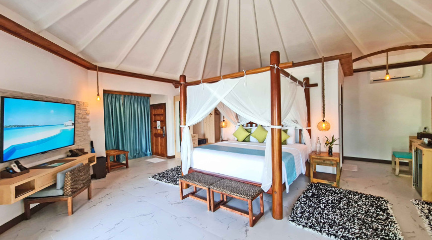 Spacious and comfortable, this villa features a quiet position among vegetation, even though offering a direct view of the ocean. It is characterized by a spacious bedroom with a comfortable king bed and a day bed sofa, a bathroom with outdoor rain shower, separate shower and bath tub, and a private garden area with wooden patio equipped with beach chairs with direct access to beach.