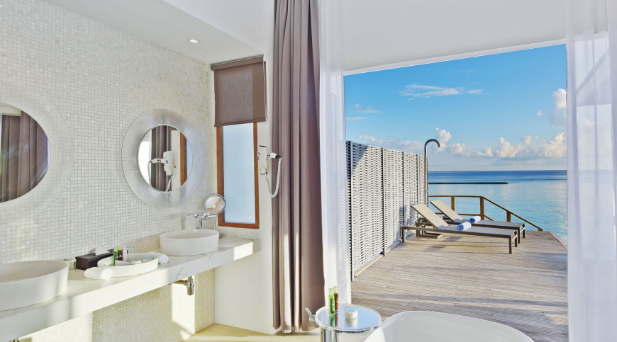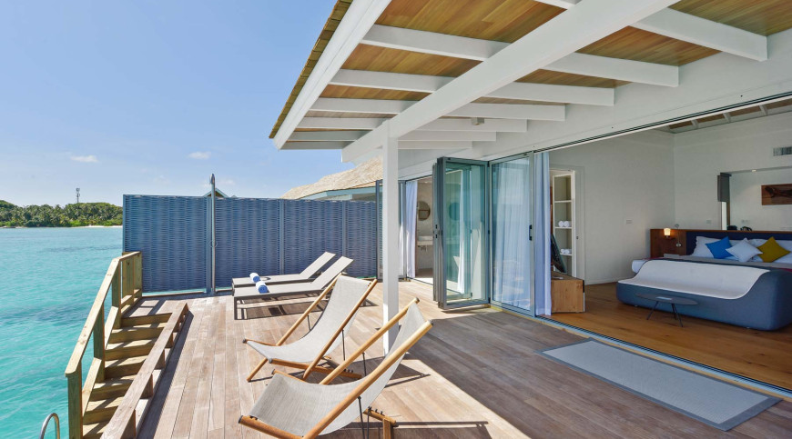 Set in the middle of our vast turquoise lagoon, the Deluxe Water Villa feature a king-sized bed and a daybed. The spacious bathroom offers a freestanding bath, and opens onto an expansive deck with steps down to the azure waters. In addition to the wide range of in-villa amenities, all villas from this category upwards also feature a fuller minibar complete with a separate wine chiller featuring over 30 bottles from around the globe.