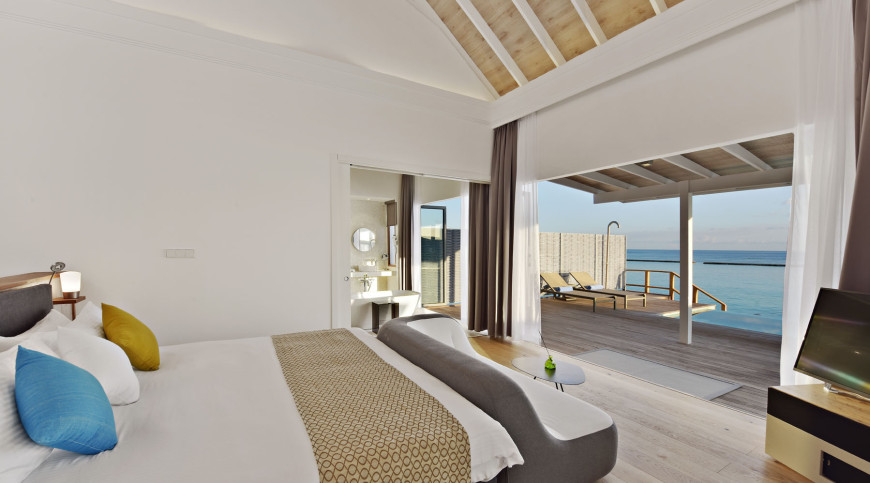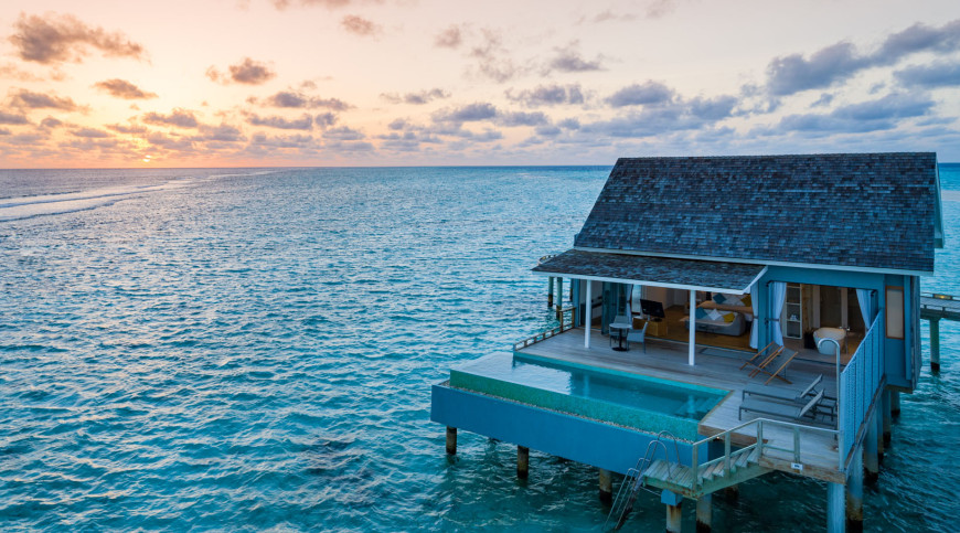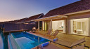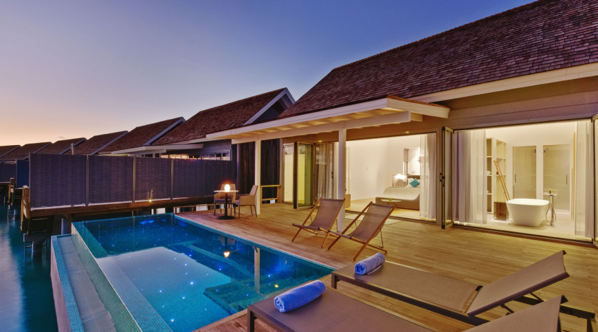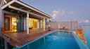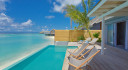 The Water Villas with Pool are located either in the crystal clear lagoon or facing the house reef, all featuring modern interiors similar to the Deluxe Water Villas. These villas also include a private pool (18sqm) overlooking the ocean.