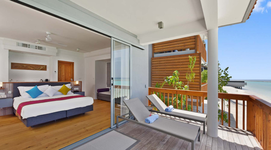 Ideal for families or friends travelling together, the 2-Bedroom Beach Houses have two storeys each featuring separate living spaces, with individual entrances. Both come with expansive bedrooms with king-sized beds, day beds and wooden sundeck, or balcony. Spacious and airy bathrooms are complete with bath, shower, vanity and outdoor rainfall shower. These duplex villas are located at the top end of the island facing either the lagoon or reef, each accommodating 6 adults or 4 adults and 2 children.
