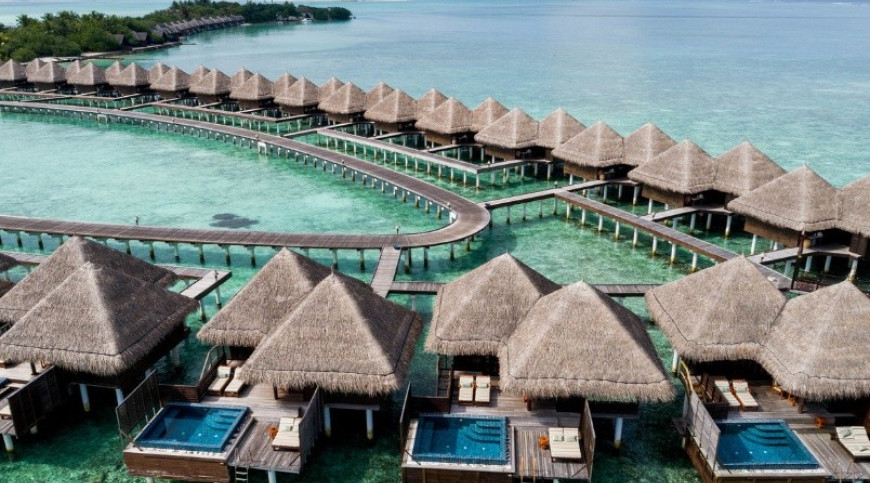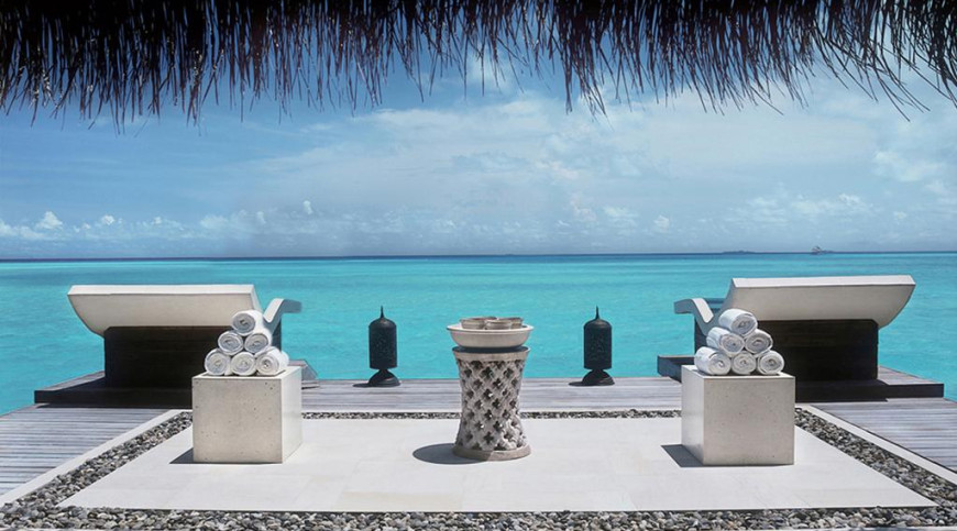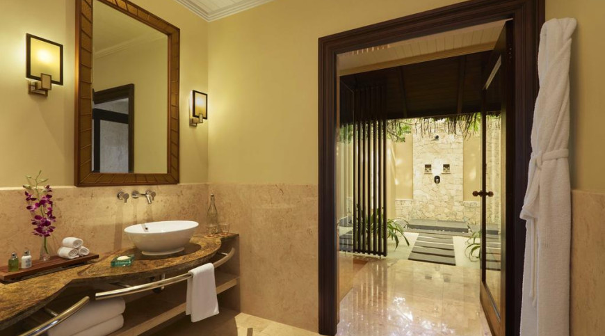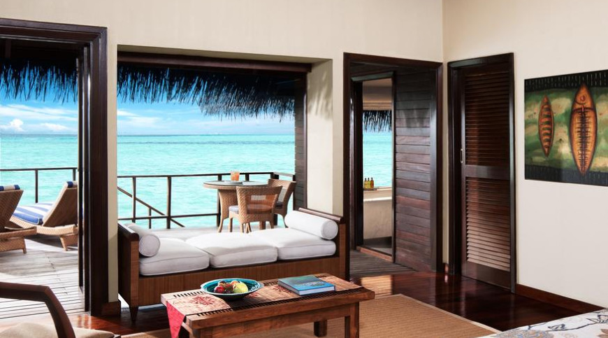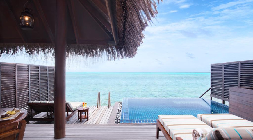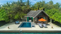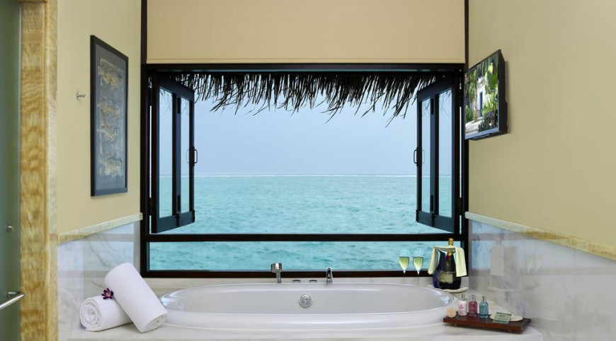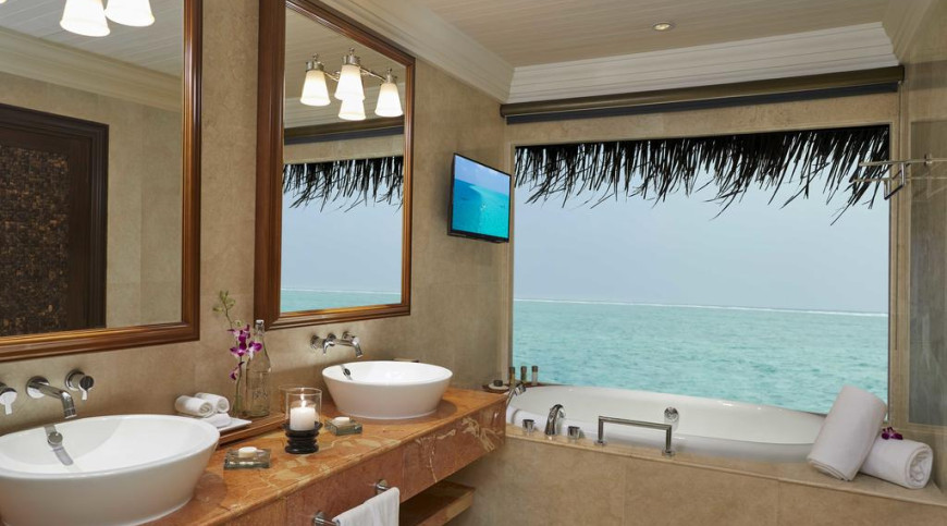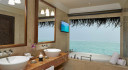 Overwater Villas built on stilts offering private sun decks with loungers, easy chairs and direct access to the lagoon. Each villa features a double vanity bathroom, rain showers and bathtubs with panoramic views of the Indian Ocean.