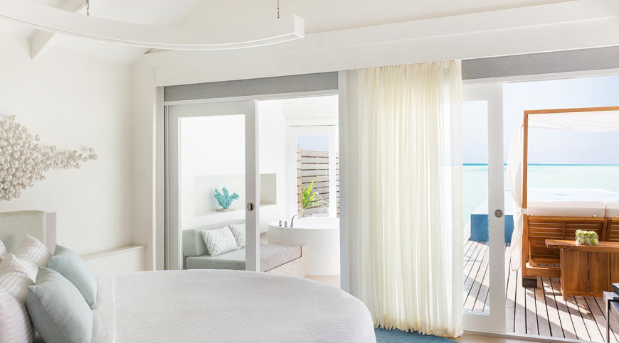 The luxurious Water Villas are suspended on stilts over the water offering incredible views of the Indian Ocean and direct access to the lagoon. With a spacious bedroom and king sized bed plus sofa bed, an over sized bathroom with a large bath tub and separate shower, plus a day bed and sun beds on the sun deck, the Water Villas make for the perfect romantic Maldives getaway.