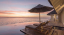 Designed for couples with unparalleled sunrise views over the Indian Ocean, the Temptation Pool Water Villa features 220 square meters of pure romance. A dedicated living space is framed by floor to ceiling windows infusing the villa with natural light. Outside, a spacious wooden deck terrace boasts a dining area and a cabana overlooking nothing less than a 14 meter infinity pool. Inside, sheer curtains adjacent to the marble-white Jacuzzi glass room freshen up the bedroom’s modern look surrounding a round shape master bed.