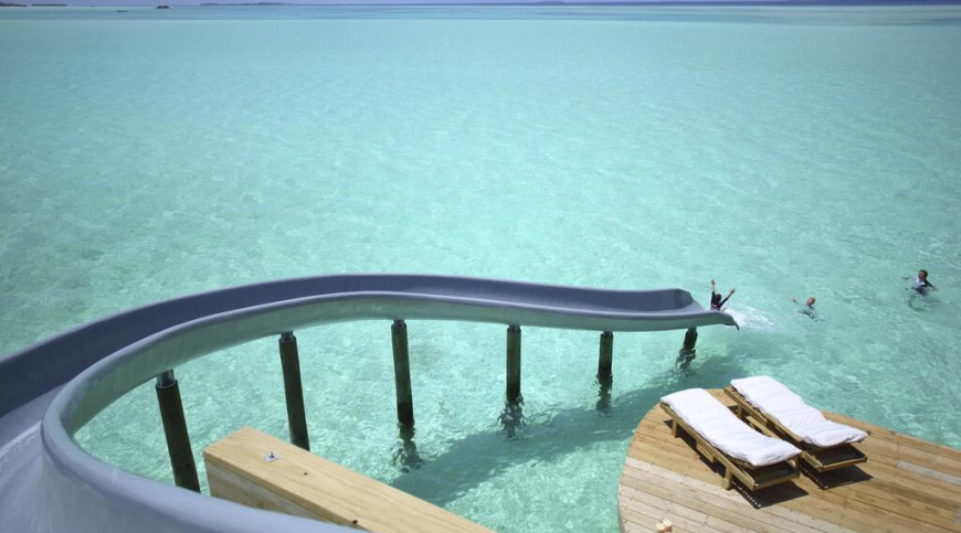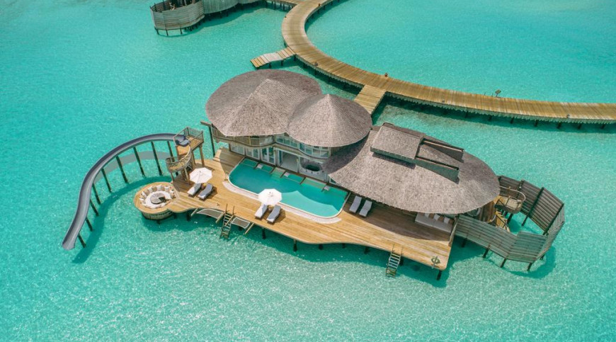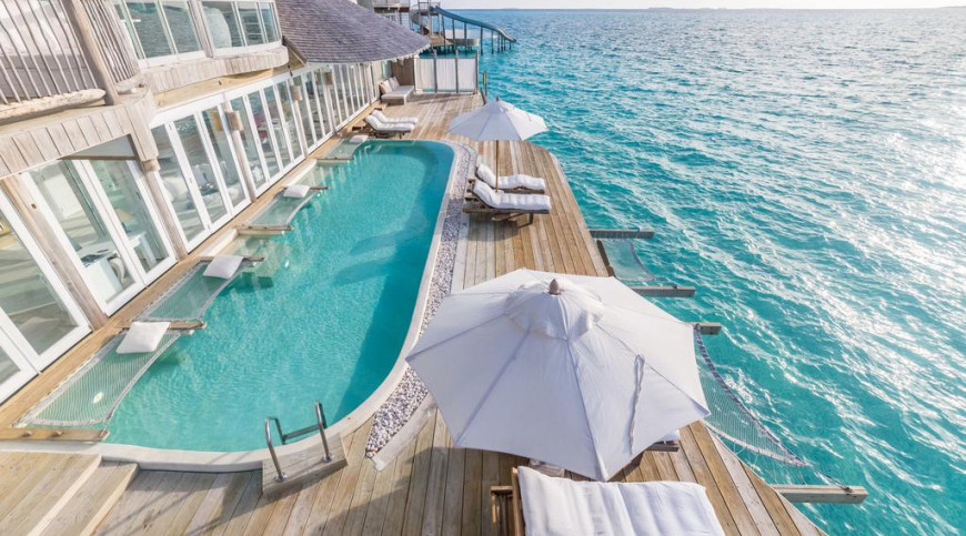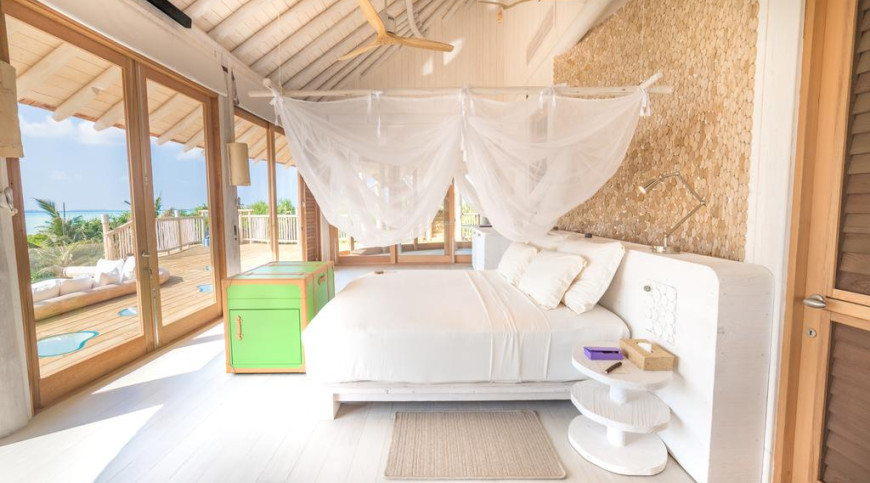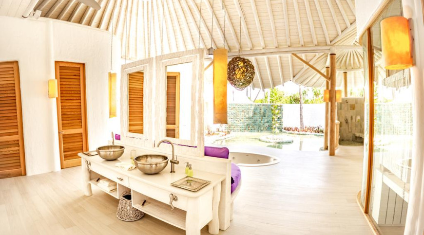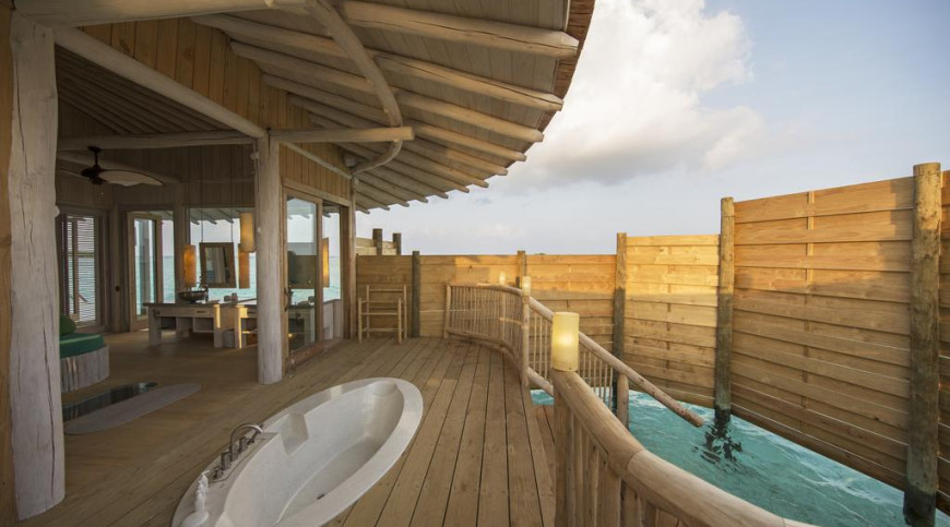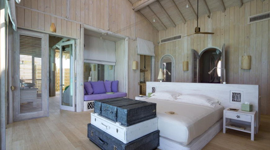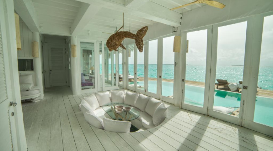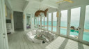 Spread across two floors, the One Bedroom Water Retreat comes with its own private pool surrounded by ample area for sunbathing and taking in ocean vistas. In addition to a childrens’ sleeping area, there is also a study, walk-in minibar, bathroom, dressing room, outdoor shower, and living area with sunken seats, perfect for lounging. Head upstairs for more seating and a dining sala with roof deck. Watch the stars from the comfort of the master bedroom with the villa’s retractable roof.
