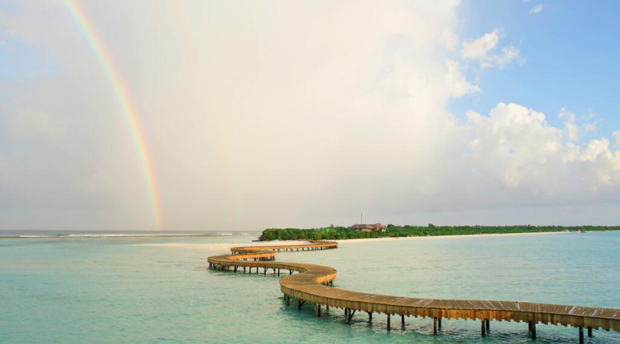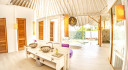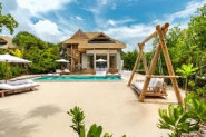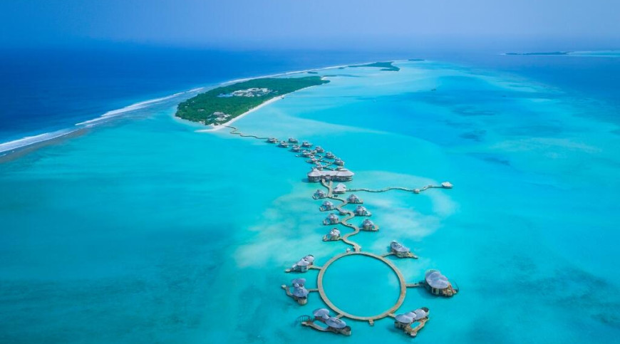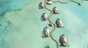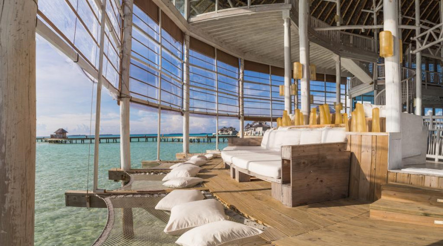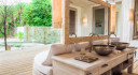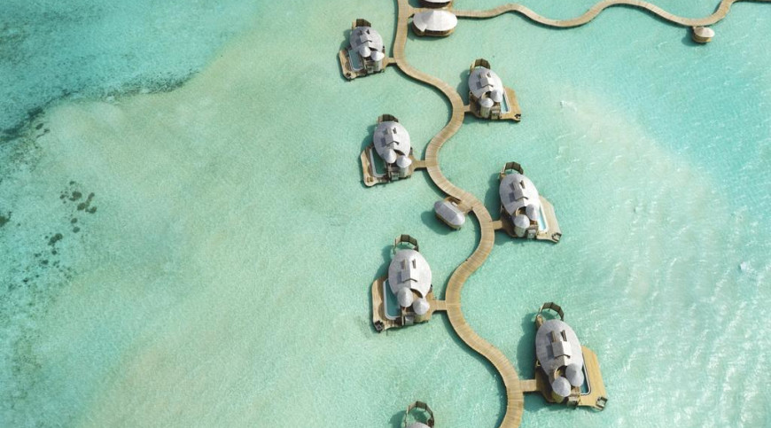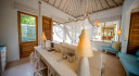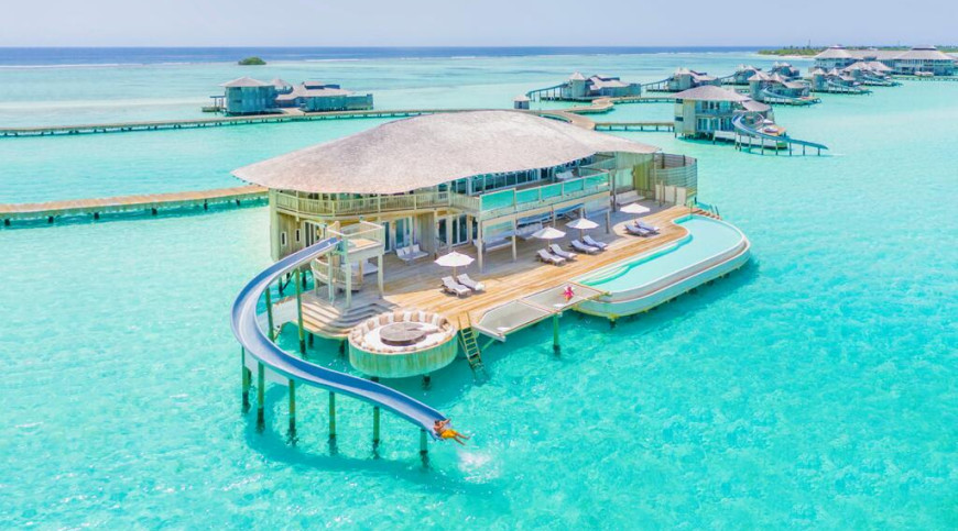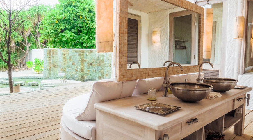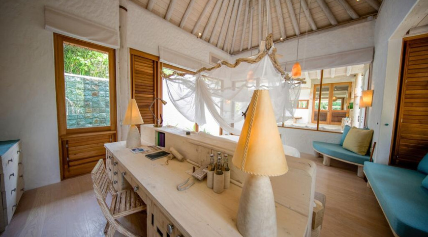 Spread across two floors, the One Bedroom Water Retreat comes with its own private pool surrounded by ample area for sunbathing and taking in ocean vistas. In addition to a childrens’ sleeping area, there is also a study, walk-in minibar, bathroom, dressing room, outdoor shower, and living area with sunken seats, perfect for lounging. Head upstairs for more seating and a dining sala with roof deck. Watch the stars from the comfort of the master bedroom with the villa’s retractable roof.