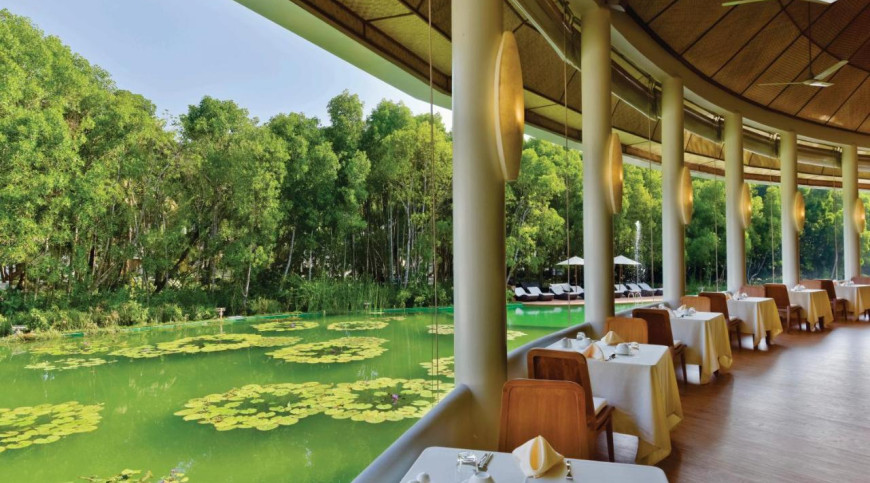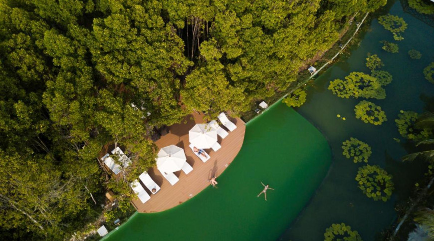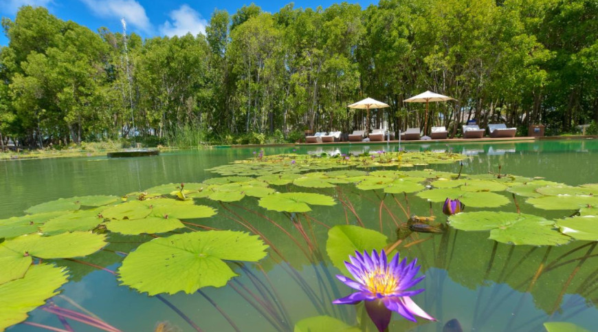 However, the most outstanding and unique feature of this island, besides the fantastic white sandy beach, is the 1600 SQM large fresh water lake which is built as a biotope in the middle of the island. In this unique lake, with a lot of water lilies and aquatic plants, there is a swimming area without chlorine where you can relax with a calming swim.