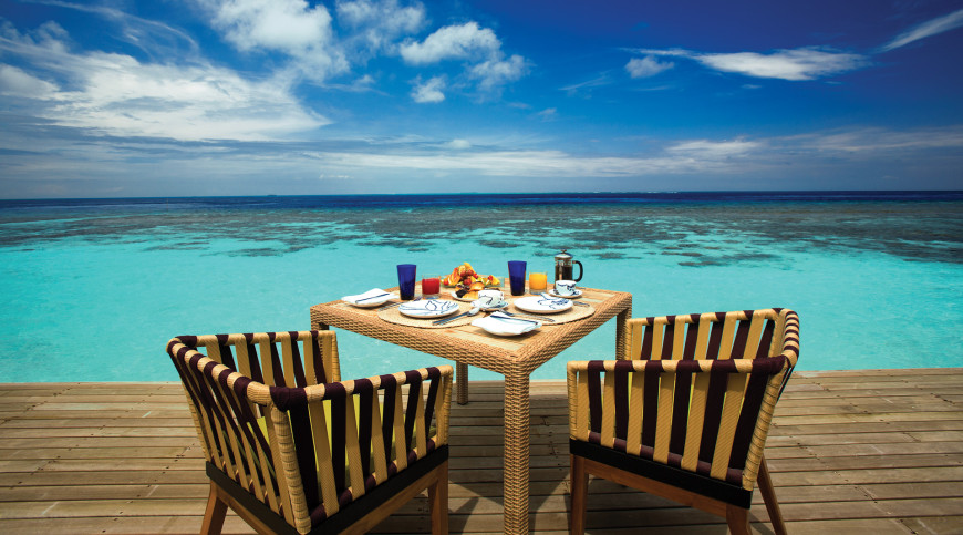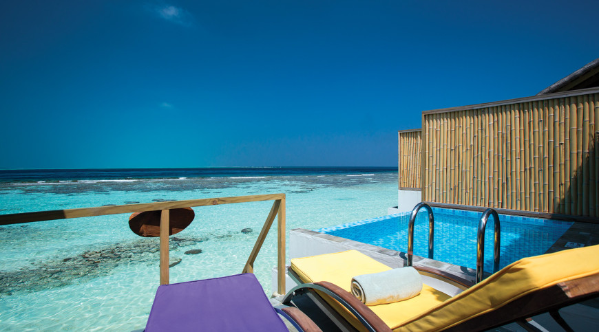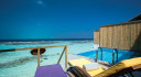 Offering spectacular sunset views, the very exclusive Water Villas with Pool are built half on land and the deck opens into the serene turquoise lagoon. Relax in the private terrace on your sun loungers as you soak in the serene views of the horizon. A large 5.2m² meter plunge pool overlooking the vast Indian Ocean completes the special Maldivian feeling!