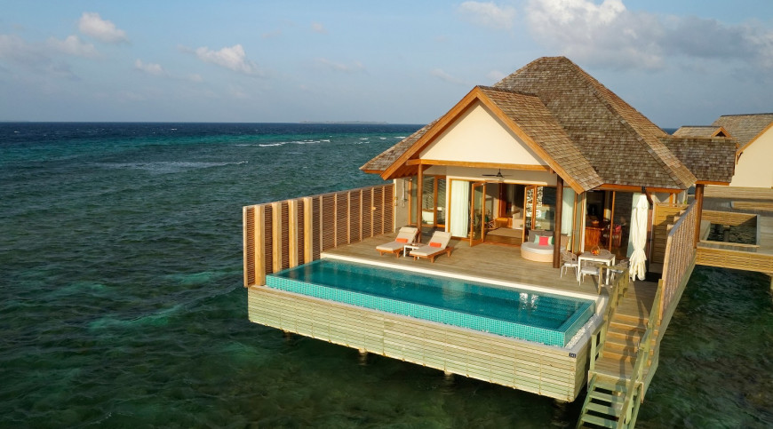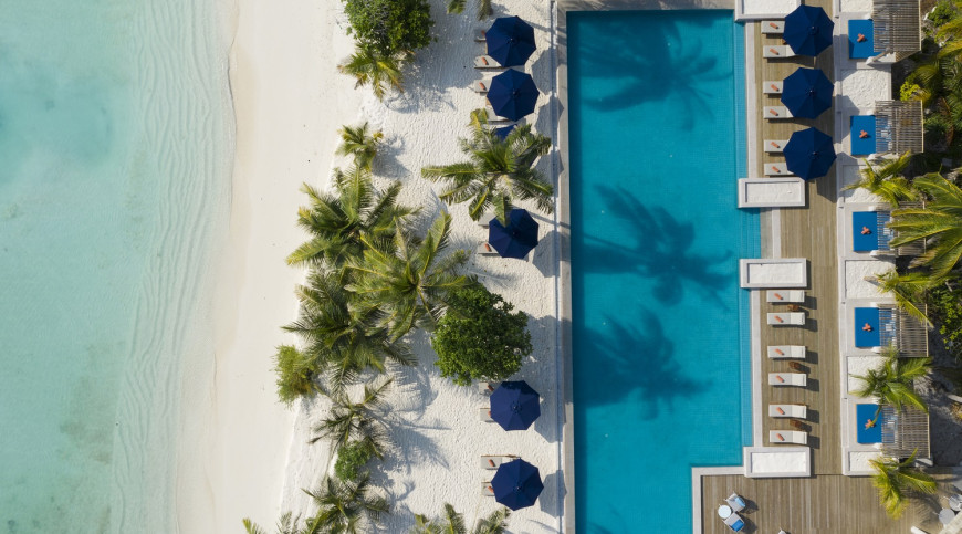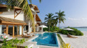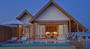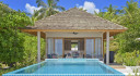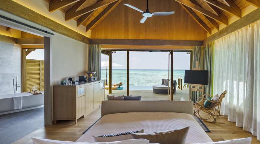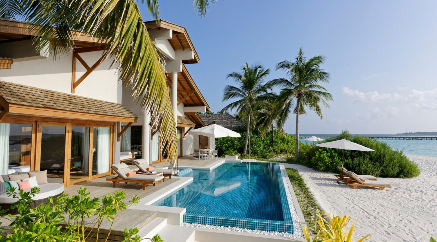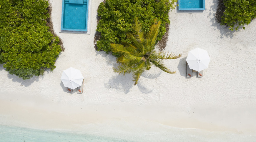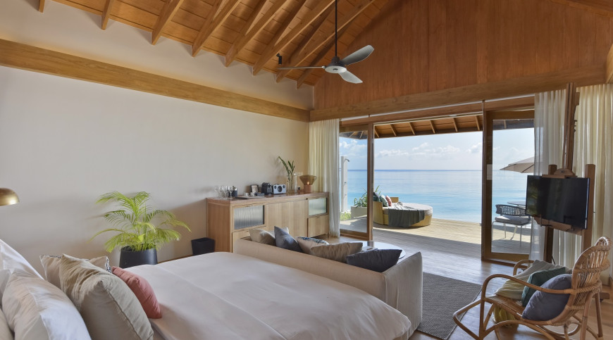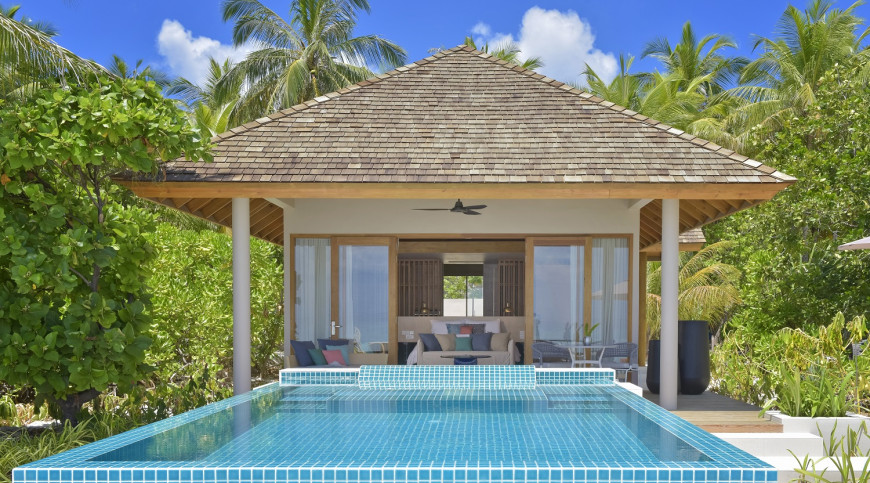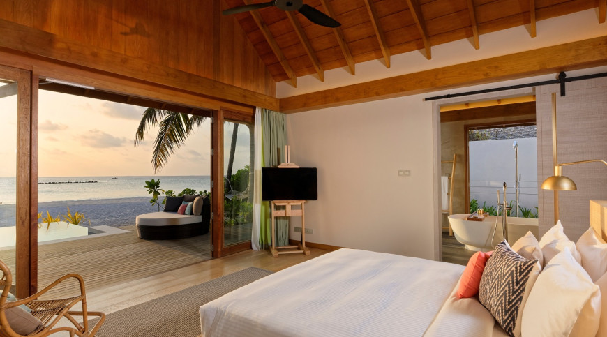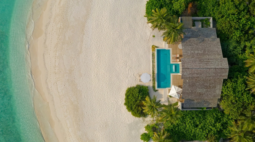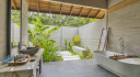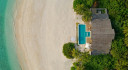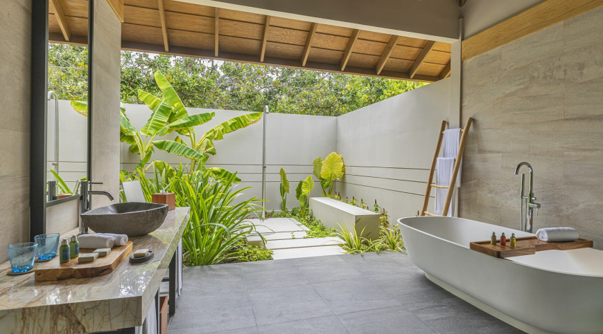 Indulgently understated architecture. Clean lines, muted wood tones and soft pastel accents. A shaded timber deck framed by foliage. Spilling onto the sand and overlooking the sea. Direct beach access, Floor-to-ceiling windows, Vaulted timber ceilings, Deck shower, Open-air bathroom, Private covered patio with lounge furniture