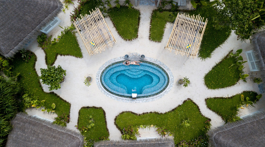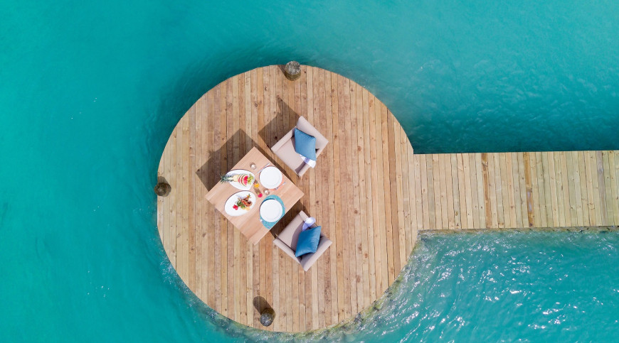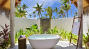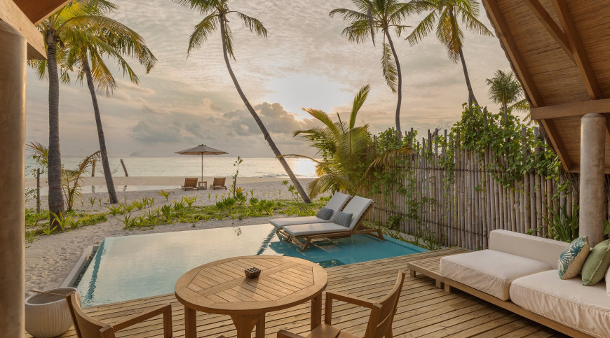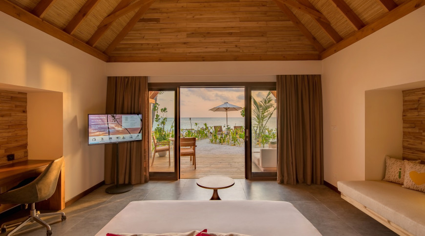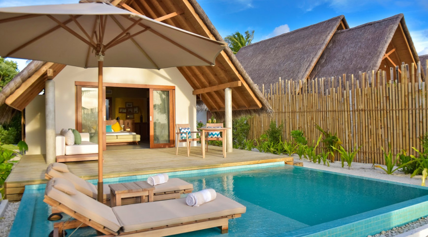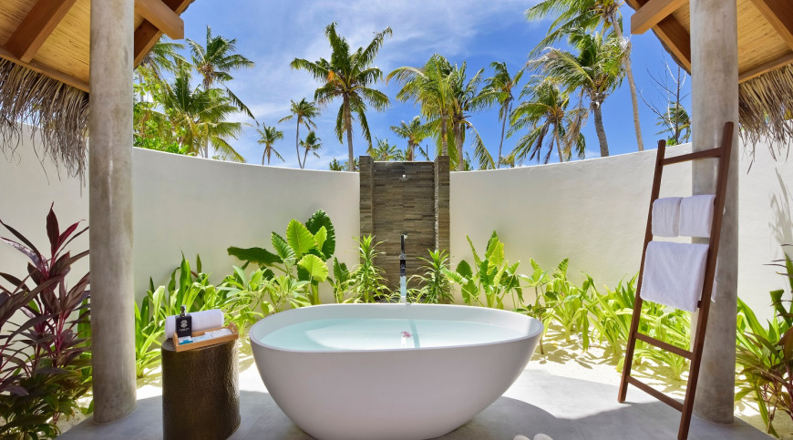 These Villas are located on the eastern side of the island facing the Sunrise and has the view of the “Maakandu”, the vast Indian Ocean.Step into a spacious bedroom with an outdoor bathroom and outdoor decking furnished for daytime and night time dining.