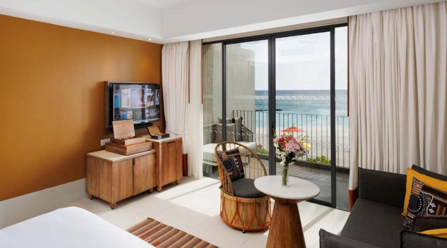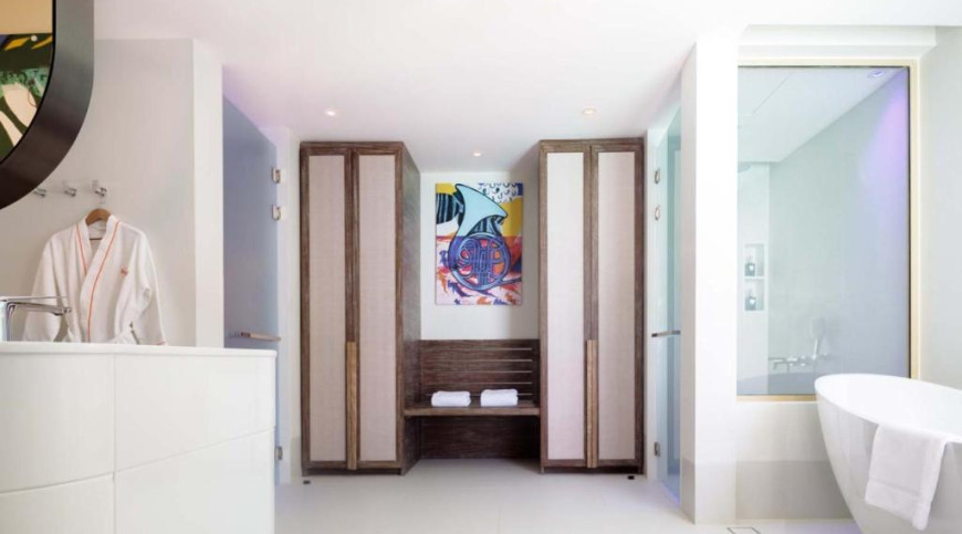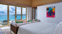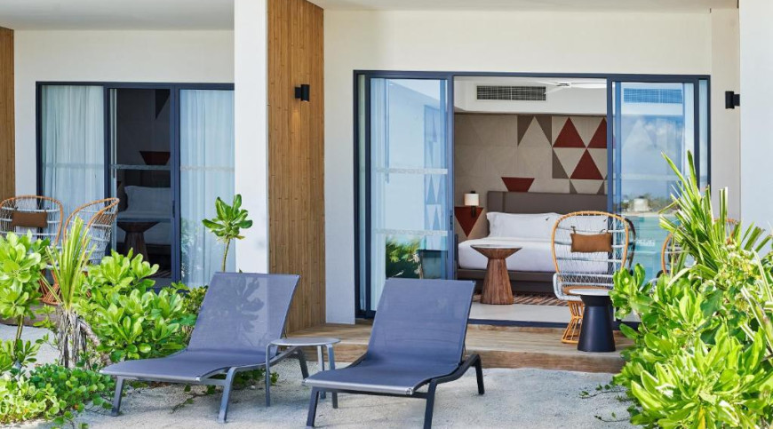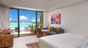 The room features a private terrace with direct beach access, ocean views, indoor and outdoor showers.