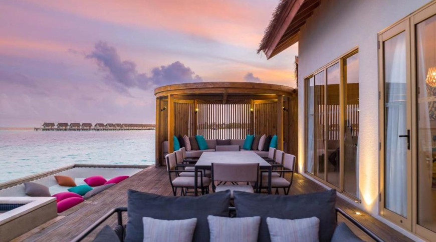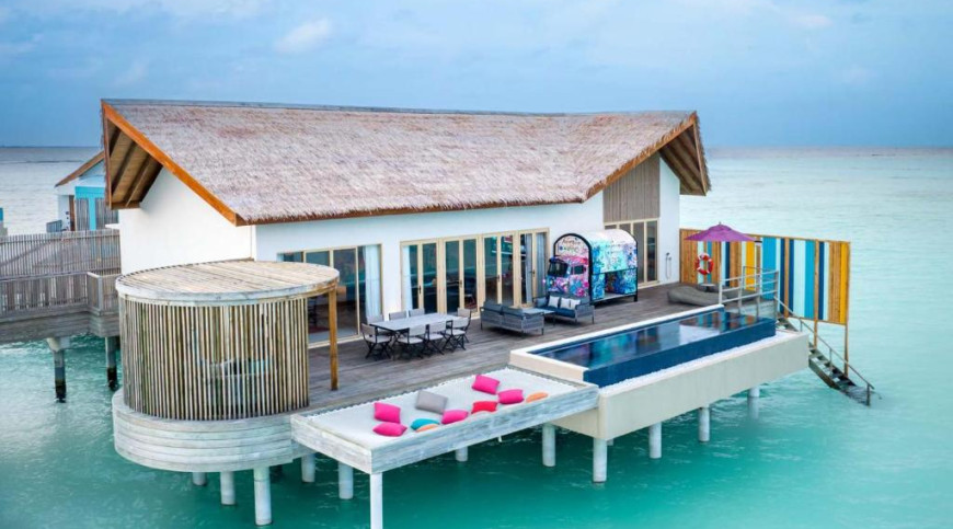 Featuring a tuk tuk bar and an infinity pool, the Rock Star Villa is located over the water and includes private boat docking access, large outdoor living deck with sun loungers, and direct lagoon access.