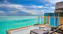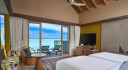 Located over the water, the Platinum Overwater Villa features a private terrace, sun loungers, and direct lagoon access.