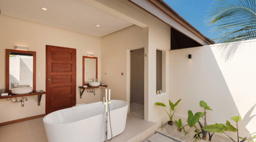 Live the serene island life in an artistic beach home that embraces the surrounding tropical landscape. Eloquent interiors, with a high-ceilinged wooden roof, cream coloured walls and a floor-to-ceiling sliding glass door that creates a bright and airy ambiance washed in natural light.