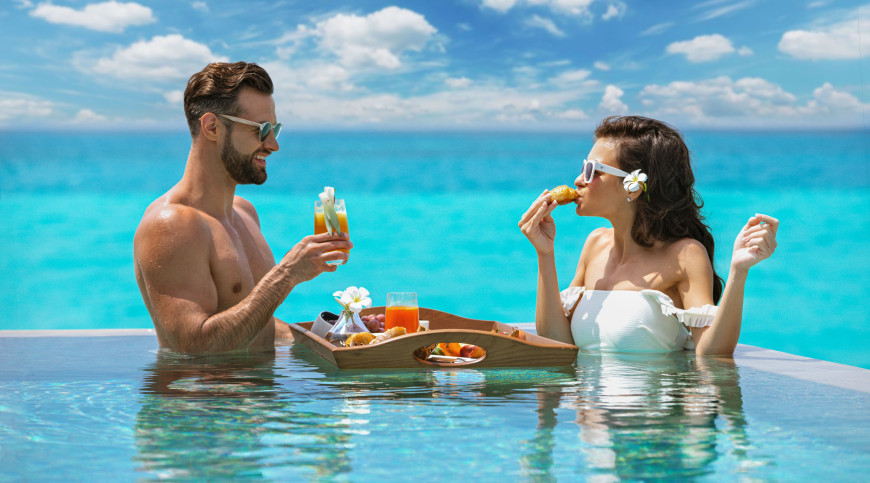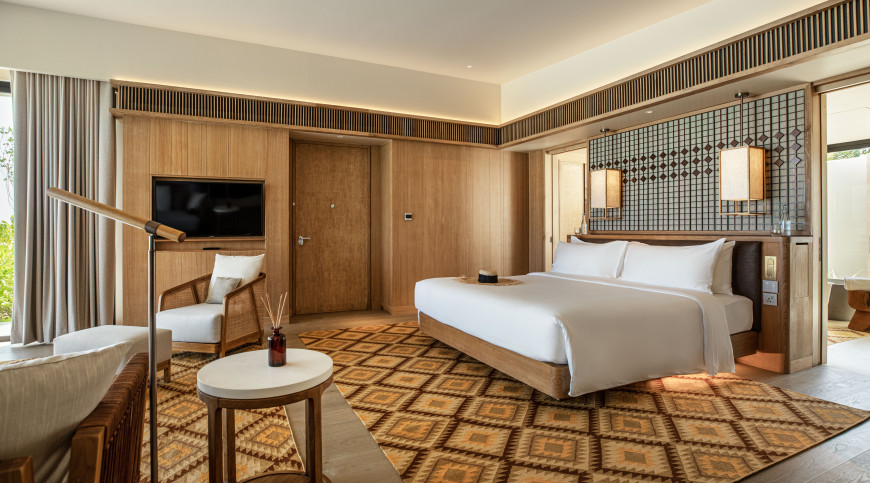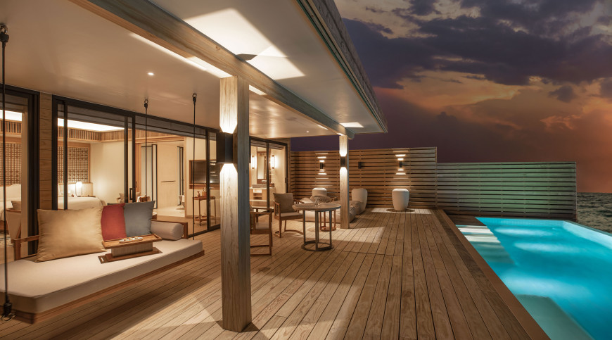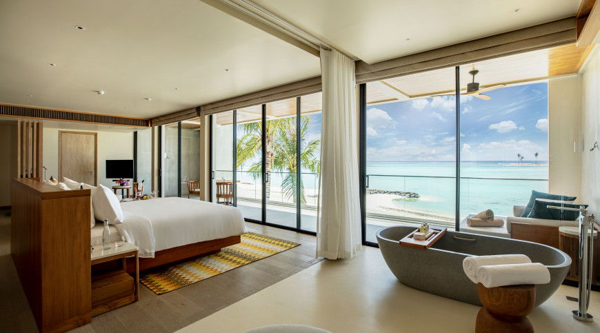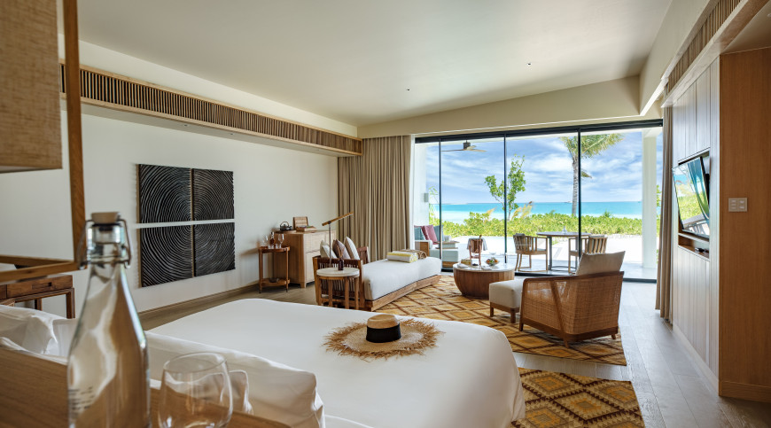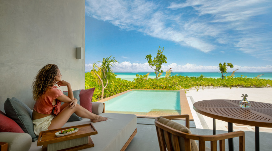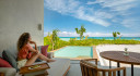 Perfectly positioned on the pearl-white beach, these villas live up to their name a tropical hideaway surrounded by lush palms caressed by the ocean breeze. High-ceilings and rustic wood furnishings are complemented by cooling stone elements, glowing in the sunlight. Relax on the ample patio in beachfront bliss, or soak in a warm bath with undisturbed views of the ocean.