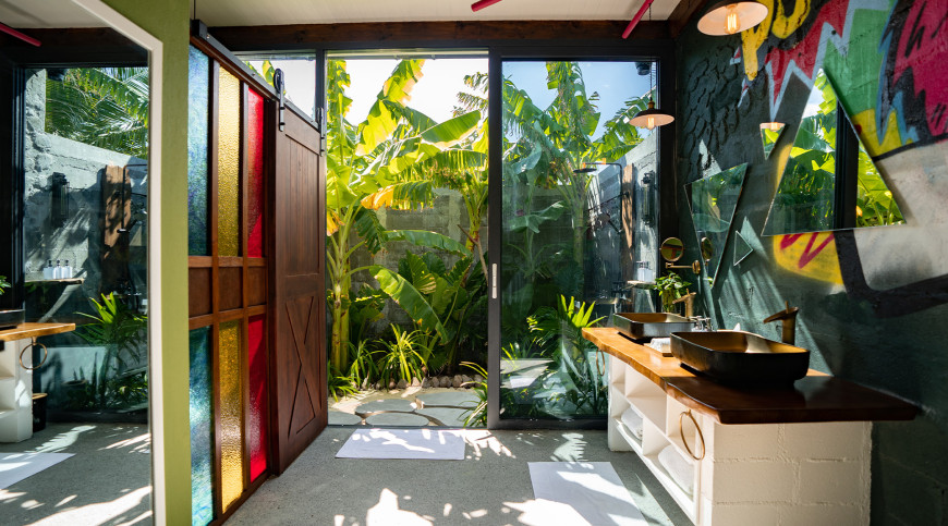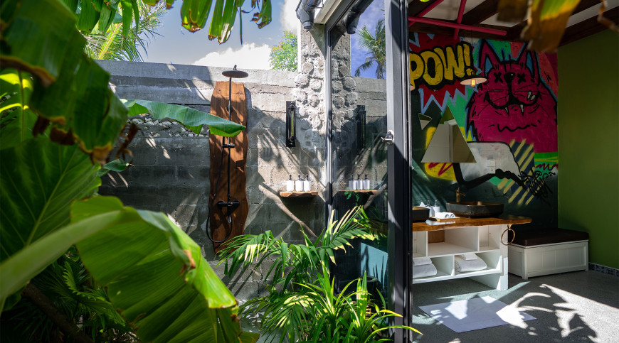 Your sunlit beach escape, a story between the lines.Our Haruge Beach Villas with Private Pool feature a modernistic A-frame with angling roofs and a high-ceiling. Past the door, we invite you to dive into one of the most dear stories in the history of Maldives, with brightly colored murals depicting the legend of two lovers — Dhon Hiyala aa’i Alifulhu. Oaga Art Resort’s Haruge Beach Villas reimagine their epic story, full of splendor, magic, and wild creatures from the deep blue sea.