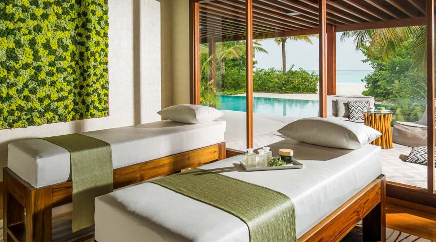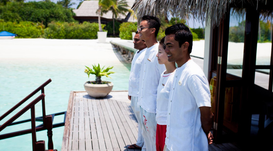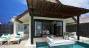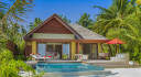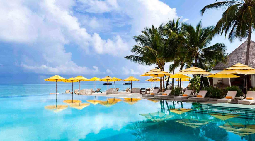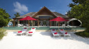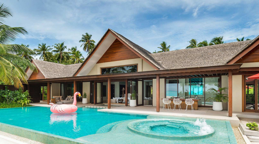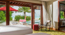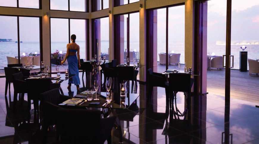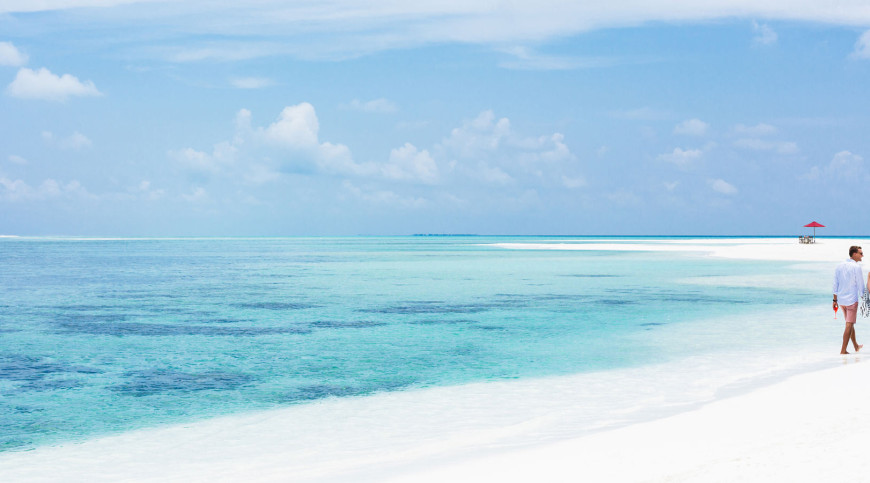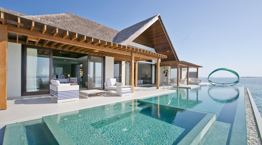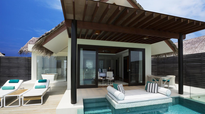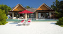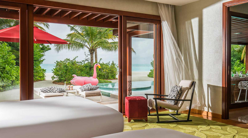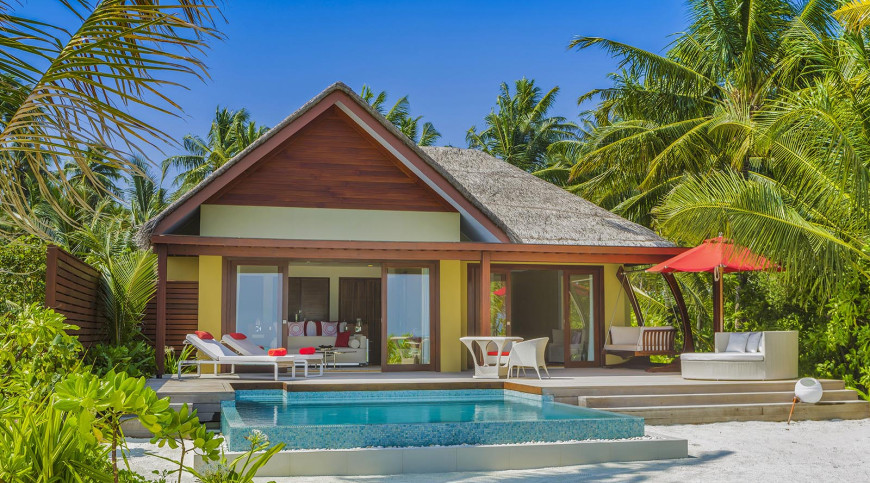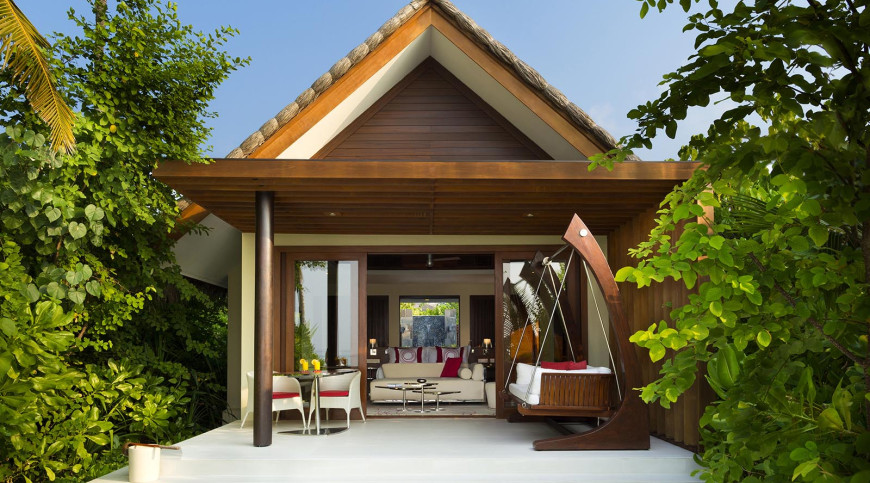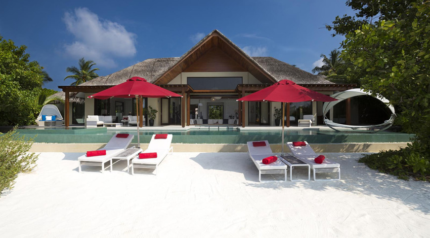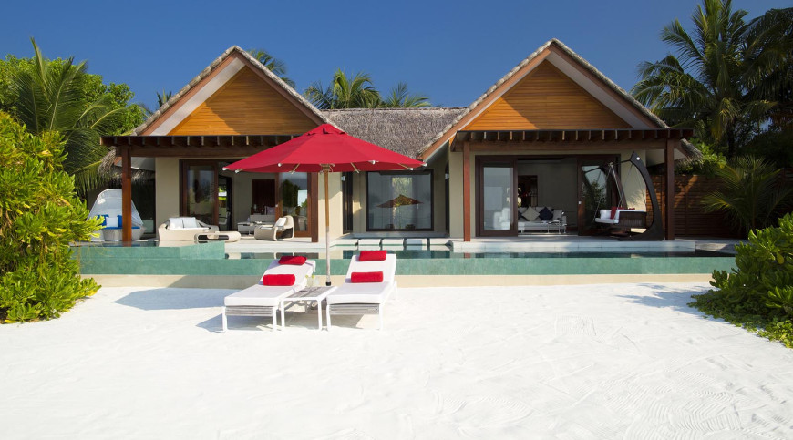 Crystal lagoon views, a sun-kissed deck, lush gardens. Sway in your Dhoni-shaped swing as the sun resurrects from the sea. Let toes sink into sand at this Maldives beach resort. Breathe.Inside, red accents explode amidst airy white interiors. High-tech toys and gourmet treats create an indoor playground, and the rain showers, your private waterfalls. For more, ring your personal Thakuru – your whim is our command.